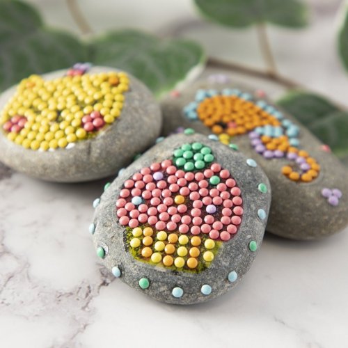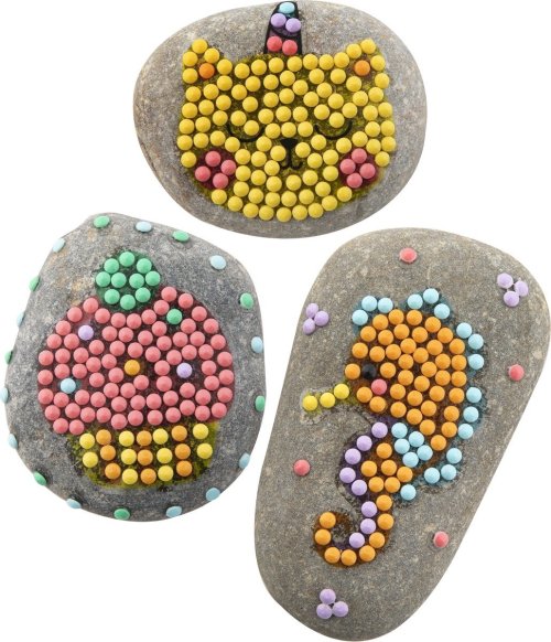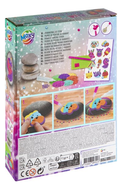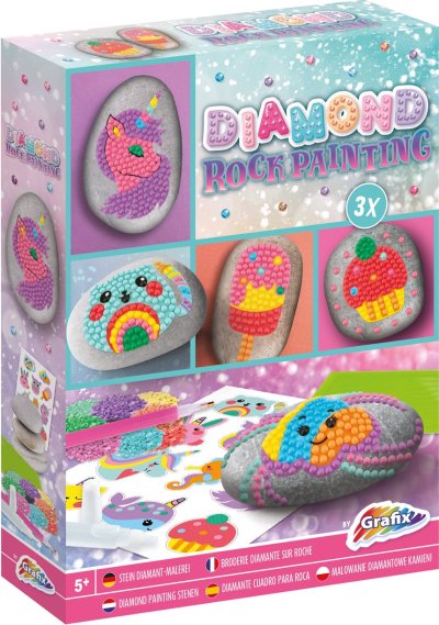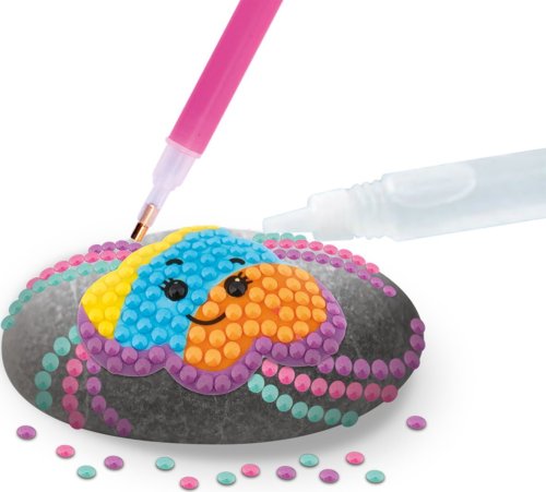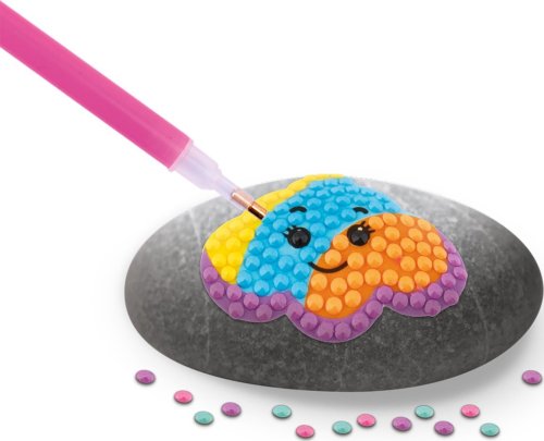 Kreativní set diamantové malování a zdobení kamínků, balení obsahuje 3 kamínky, list samolepek, více než 1500 kusů diamantů, tácek a lepící pero 21x15,5 cm