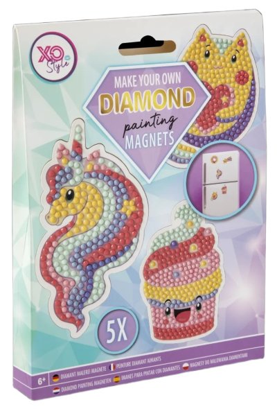 Kreativní sada na výrobu diamantových magnetů, které ozdobí lednici nebo každý povrch, kam lze magnety umístit. Sada obsahuje 2850+ diamantů/kamínků, předlohu/magnety k dokončení - 5 kusů, aplikační pero, lepící čtvereček a tácek, 18x13 cm