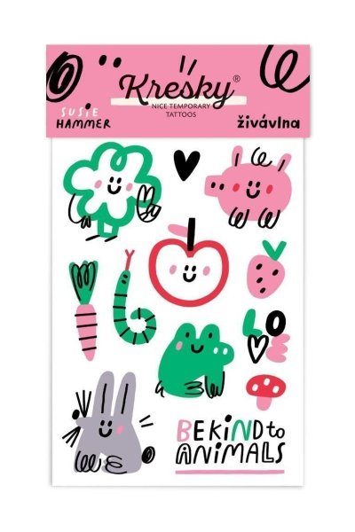 Zářivé a rozkošné ilustrace zvířátek, ovoce a zeleninky nakreslila ilustrátorka Susie Hammer. Připomínají nám, že je dobré se ke zvířátkům a životnímu prostředí chovat mile. Zeleninovo-ovocno-zvířátkové tetovačky jsou součástí kolekce Be kind to animals od iniciativy Živá vlna, která se zasazuje za práva zvířat a ochranu přírody s přesahem do tvorby, především ilustrace a designu. Dočasné tetování neaplikujte na citlivou pokožku, v blízkosti očí nebo v případě alergie. Dermatologicky testováno, bezpečné pro děti.