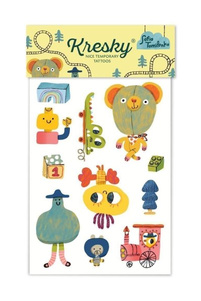 Sadu tetovaček s dětskými hračkami nakreslila ukrajinská ilustrátorka Sofia Tomilenko. Rozhodla se pro ikonické hračky, s jakými jsme si hrály jako děti nejen my, ale zná je i každé současné dítě. Dřevěné skládačky, vláček, krokodýl na provázku, i plyšová hračka, ve které každé dítě vidí něco jiného. Dočasné tetování neaplikujte na citlivou pokožku, v blízkosti očí nebo v případě alergie. Dermatologicky testováno, bezpečné pro děti.