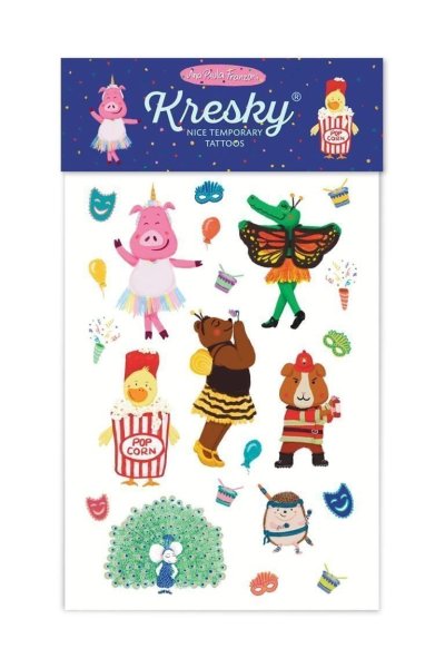 Někdo je za páva, jiný za popcorn, to je ale pestrý karneval! Se zvířátky v nečekaných kostýmech si vyhrála Ana Paula Franzoni. Dočasné tetování neaplikujte na citlivou pokožku, v blízkosti očí nebo v případě alergie. Dermatologicky testováno, bezpečné pro děti.