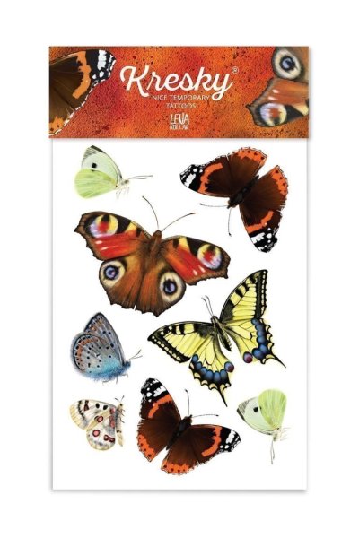 Jemní, barevní a téměř jako živí jsou motýli od Leny Kollar. Babočka paví oko i admirál, jasoň červenooký, bělásek zelný, modrásek černolemý a otakárek fenyklový. Který motýl je tvůj oblíbený? Dočasné tetování neaplikujte na citlivou pokožku, v blízkosti očí nebo v případě alergie. Dermatologicky testováno, bezpečné pro děti.