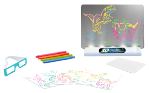 Jak to funguje? Stačí namalovat obrázek na přiloženou destičku, vložit ho do speciální čtečky a nasadit 3D brýle – tvé kresby se promění v trojrozměrné mistrovské dílo!