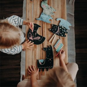 Dřevěná tabulka se 4 křídami rozvíjí grafomotorické dovednosti, podporuje kreativitu a fantazii.