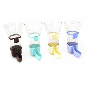 Otevřené plastové krmítko určené k upevnění na dráty klece umožňuje kontinuální doplňování krmiva bez nutnosti otvírání klece.