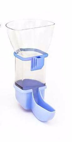 Otevřené plastové krmítko určené k upevnění na dráty klece umožňuje kontinuální doplňování krmiva bez nutnosti otvírání klece.