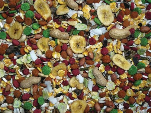 složení: ovoce, (banány, jablka, rozinky, aronie), pšenice, kukuřice, pšeničné vločky, svatojánský chléb, burské ořechy, hrachové vločky, safrol, slunečnice, kukuřičné vločky, čirok, ječmen, vojtěška, oves, mrkev, pohanka.