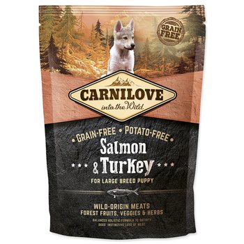 Složení: dehydrovaný losos (25 %), dehydrovaný krocan (20 %), žlutý hrách (20 %), kuřecí tuk (chráněno tokoferoly 10 %), kachní moučka (5 %), hydrolyzovaný losos (5 %), kuřecí játra (3 %), jablka (3 %), lososový olej (2 %), mrkev (1 %), lněné semínko (1 %), cizrna (1 %), hydrolyzované skořápky korýšů (zdroj glukosaminu, 0,05 %), extrakt z chrupavek (zdroj chondroitinu, 0,03 %), pivovarské kvasnice (zdroj mannan-oligosacharidů, 0,015 %), kořen z čekanky (zdroj frukto-oligosacharidů, 0,01 %), juka schidigera (0,01 %), mořská řasa (0,01 %), psyllium (0,01 %), tymián (0,01 %), rozmarýn (0,01 %), oregano (0,01 %), brusinky (0,0008 %), borůvky (0,0008 %), maliny (0,0008 %). Analytické složky: hrubý protein 36 %, obsah tuku 16 %, hrubý popel 7,8 %, hrubá vláknina 3 %, vlhkost 10 %, vápník 1,3 %, fosfor 1 %. Nutriční doplňkové látky na 1 kg: vitamín A (E672) 20 000 m.j., vitamín D3 (E671) 1 500 m.j., vitamín E (α-tokoferol) (3a700) 400 mg, zinek (E6) 85 mg, železo (E1) 70 mg, mangan (E5) 35 mg, jód (E2) 0,65 mg, měď (E4) 15 mg, selen (3b8.10) 0,25 mg. Metabolizovatelná energie: 3 790 kcal/kg. Krmný návod: Podávejte suché nebo navlhčené vodou. Denní dávka se bude lišit podle věku, velikosti, výkonu a prostředí. Doporučené denní dávkování je uvedené v krmné tabulce. Pokud podáváte krmivo Carnilove poprvé, v prvním týdnu podávejte smíchané s původním krmivem a postupně navyšujte podíl Carnilove v celkové denní dávce. Nezapomeňte ke krmení vždy připravit miskou s čerstvou pitnou vodou. Spotřebujte do data uvedeného na obalu. Uchovejte v suchém a chladném místě.