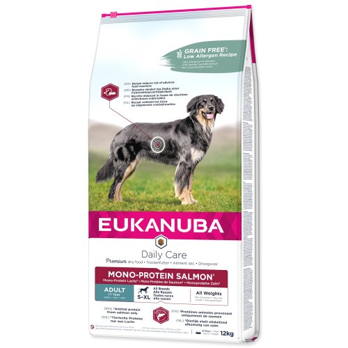 Suché krmivo EUKANUBA Daily Care pro dospělé psy – monoprotein, losos je receptura s jediným zdrojem živočišných bílkovin. Všechny živočišné složky v této jednodruhové stravě jsou pouze z lososa, aby se snížilo riziko nežádoucích reakcí na krmivo a podpořily se štíhlé svaly.