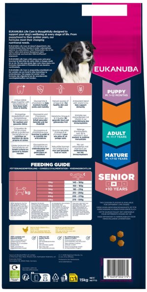 Složení: | Sušené kuřecí a krůtí (26 % včetně kuřecí 18 %, přirozený zdroj glukosaminu, chondroitinu a taurinu), čerstvé kuřecí (17 %), kukuřice, pšenice, drůbeží tuk, oves, rýže, ječmen, sušená řepná dužina (3%), kuřecí šťáva, minerální látky (včetně hexametafosforečnanu sodného 0,34 %), sušená celá vejce, fruktooligosacharidy (0,37 %, přírodní prebiotikum), mannanoligosacharidy (0,13 %, přírodní prebiotikum), glukosamin (z živočišné tkáně) (0,04 %), chondroitin sulfát (0,004 %). |