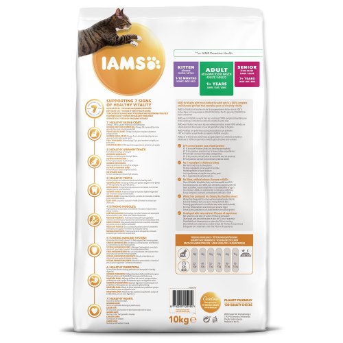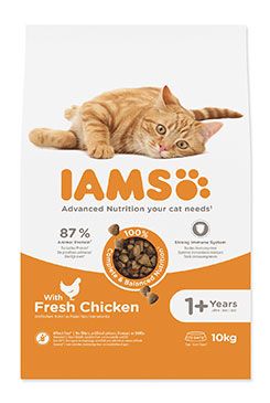 Krmivo IAMS for Vitality pro dospělé kočky je 100% kompletní a vyvážené, odborníky sestavené krmivo, které bude vašemu zvířeti chutnat a svědčit. Naše nová a vylepšená receptura pro dospělé kočky s čerstvým kuřecím masem je založena na kvalitních živočišných bílkovinách pečlivě vybraných tak, aby podporovaly sedm znaků zdravé vitality kočky. Aby byly kočky zdravé, aktivní a plné energie, obsahují naše lahodné receptury až 87 % živočišných bílkovin (z celkového obsahu bílkovin).