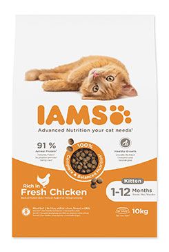 Krmivo IAMS for Vitality pro koťata je 100% kompletní a vyvážené, odborníky sestavené krmivo, které bude zvířeti chutnat a svědčit. Naše nová a vylepšená receptura pro koťata s čerstvým kuřecím masem je založena na kvalitních živočišných bílkovinách pečlivě vybraných tak, aby podporovaly sedm znaků zdravé vitality koťat. Aby byla koťata zdravá, aktivní a plná energie, obsahují naše lahodné receptury až 91 % živočišných bílkovin (z celkového obsahu bílkovin).