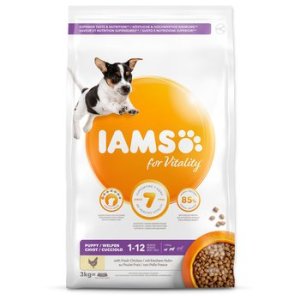 Krmivo IAMS for Vitality pro štěňata malých a středních plemen je 100% kompletní a vyvážené odborníky sestavené krmivo, které bude vašemu štěněti svědčit. Naše nová a vylepšená receptura pro štěňata s čerstvým kuřecím masem je založena na kvalitních živočišných bílkovinách, které byly pečlivě vybrány, aby podporovaly sedm znaků zdravé vitality štěněte. Aby byla štěňata zdravá, aktivní a plná energie, obsahují naše lahodné receptury až 85 % živočišných bílkovin z kuřecího masa (z celkového obsahu bílkovin).