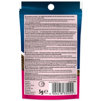 Nové krmivo Tetra Betta Larva Sticks nabízí druhově odpovídající krmivo, které ideálním způsobem pokrývá nutriční potřeby tropických ryb rodu betta a jiných labyrintek. Toto speciální krmivo připomíná svou velikostí, tvarem a barvou komáří larvy, jednu z nejoblíbenějších rybích pochoutek. Toto nové speciální krmivo je ideální k vytvoření přirozených podmínek rybám v akváriu: krmivo plave na hladině vody. Osahuje velice chutné krevetky a vysoký obsah karotenoidů, čímž posiluje zářivé zbarvení ryb. Vysoce kvalitní bílkoviny a omega-3 mastné kyseliny poskytují dostatečnou energii pro zajištění zdravého růstu. BioActive formule pomáhá udržovat rybám zdravý imunitní systém a zvyšuje jejich odolnost, energii a vitalitu.