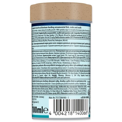 Zelené tablety jsou s vysokým obsahem řasy spiruliny, která je nejlepší potravou pro býložravce, žijící u dna. Hnědé jsou nejvhodnější pro masožravce. Tablety mají přesně vyvážené složení, takže se ve vodě pozvolna rozpouští. Tyto ryby a raci si obvykle svou potravu šetří, takže toto krmení plně odpovídá jejich požadavkům.