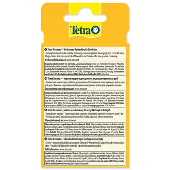 Kompletní krmivo pro okrasné akvarijní ryby. Tetra Weekendfutter pomalu klesá ke dnu a tak umožňuje stejnoměrné krmení Vašich ryb. Tetra Weekendfutter naprosto neobsahují umělá pojidla, například sádru.