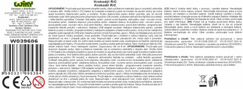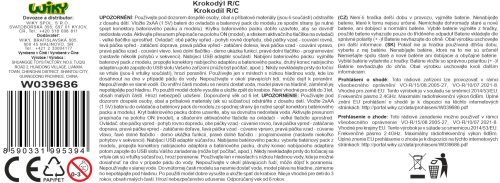 Frekvence 2.4GHz. Světelné efekty očí. 3.7V bateriový pack do krokodýla součástí, 2xAA do ovladače nejsou součástí.