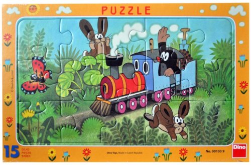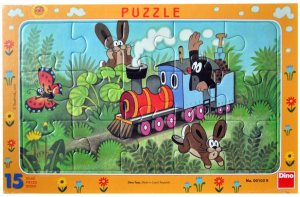 Deskové puzzle s motivem Krtečka v lokomotivě obsahující 15 dílků. Velikost složeného obrázku je 25 x 14,5 cm. Vhodné pro děti od 3 let.