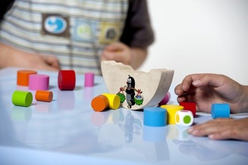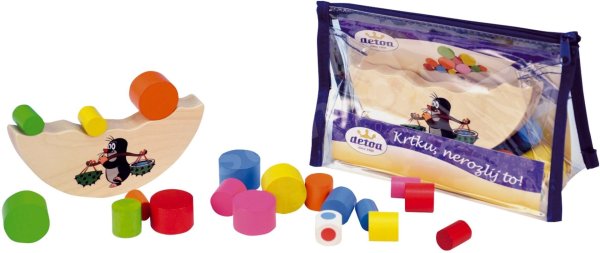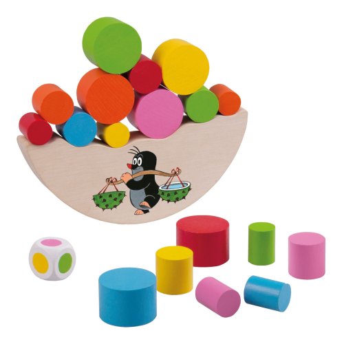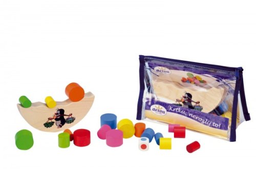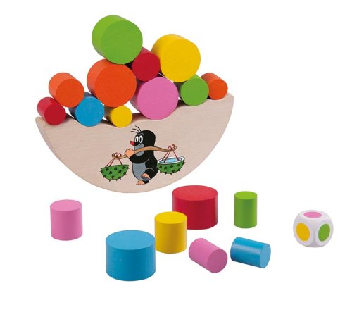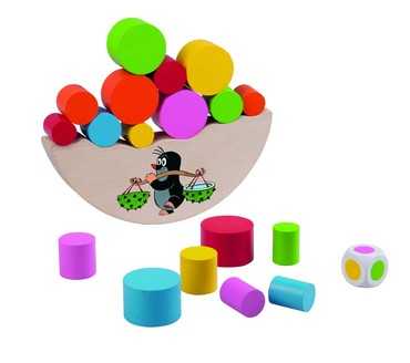 Balanční hračka Krtku nerozlij to! Vhodné pro děti od 4 let. Hra slouží k rozvoji jemné motoriky dítěte. Výrobek je zdravotně nezávadný. Hra je určená pro 2 - 6 hráčů. Vždy začíná nejmladší hráč. Hodí kostkou, vybere váleček barvy, která mu padla, a vloží váleček libovolně na vršek dřevěného dílku. Hra pokračuje, dokud se válečky nerozsypou nebo se dílek s Krtkem nepřevrátí.