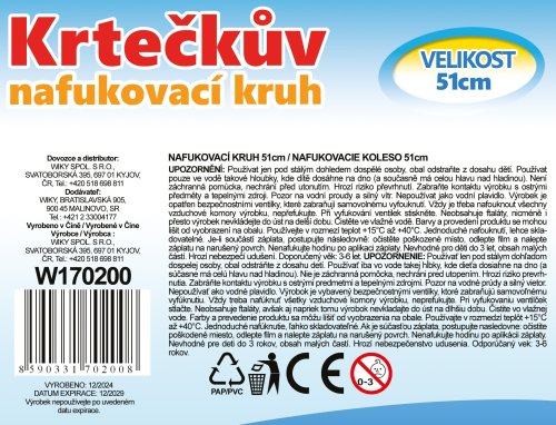 Nafukovací koupací kruh s motivem oblíbeného dětského hrdiny Krtečka a jeho přátel - žáby, myšky a dalších. Vhodné pro děti od 3 let. Rozměr 51 cm.