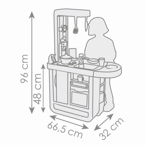 Kuchyňka Cherry v moderním designu se spoustou kuchyňských doplňků obsahuje 25 příslušenství. Kompaktní a realistická dětská kuchyňka, která je celá navržena v moderním designu současných kuchyní. Díky krásnému zbarvení v jemných pastelových tónech se hodí do dětského pokoje i do společného obývacího pokoje. Kuchyně Cherry má sporák se dvěma plotýnkami, troubu a digestoř. Elektronický zvukový modul v jedné z plotýnek zajišťuje realistické zvuky vaření. Kuchyňka na hraní má také lednici, dřez s kohoutkem a espresso kávovar s různými kapslemi na čaj a kávu. Maso a ryby mají dvě různé strany, syrové a smažené. Rozsáhlé příslušenství lze snadno uložit do jedné z mnoha polic. Hrací plocha je rozšířena o malý stolek. Součástí vybavení je rendlík s poklicí, talíř, příbory, nádobí, makety obalů od jídla, hrnek, hrneček a pánev. Výška pracovní plochy: 48,5 cm. Rozměry produktu (DxŠxV): 66,5 x 32 x 95,7 cm.