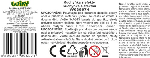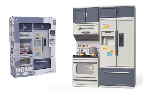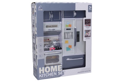 Kuchyňka s efekty. Rozměry 22,5x7x30 cm. Světelné a zvukové efekty tlačítkem na sporáku. 3xAG13 baterie do sporáku součástí. Obsah - trouba se sporákem, odpařovač, lednice, skříňky, nádobí.