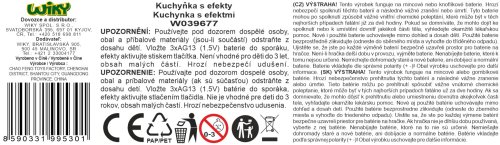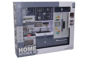 Kuchyňka s efekty. Rozměry 36x7x30 cm. Světelné a zvukové efekty tlačítkem na sporáku. 3xAG13 baterie do sporáku součástí. Obsah - trouba se sporákem, odpařovač, dřez, lednice, skříňky, nádobí, jídlo.