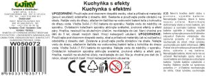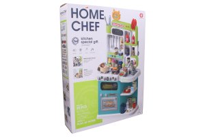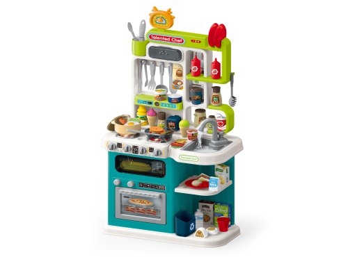 Kuchyňka s efekty. Velikost sestavené kuchyňky 44,5x24x92 cm. Návod na složení na obalu. 3xAA baterie nejsou součástí balení. Součástí kuchyňky je dřez, trouba, mikrovlnka, vařič, police. Balení osahuje bohaté příslušenství do kuchyně-nádobí a potraviny. Dřez lze naplnit vodou a po stlačení páčky na vodovodním kohoutky z něj stříká voda. Po nalití vody do vařiče vychází pára. Světelné a zvukové efekty.