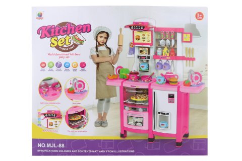 Plastová kuchyňka s kompletním příslušenstvím. Obsahuje sporák, myčku, dřez, troubu, lednici a plno dalších doplňků. Součástí je plastové nádobí, potraviny a jídlo. Kuchyňka funguje na baterie. Sporák, digestoř a mobilní telefon vydává zvuky a svítí. Ve dřezu teče voda. Napájení na 8 AA baterií (nejsou součástí). Rozměry kuchyňky cca 80 x 100 x 30 cm. Rozměry balení cca 59 x 20 x 50 cm. Věk 3+