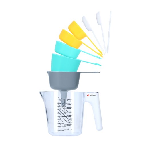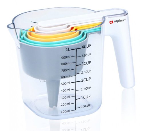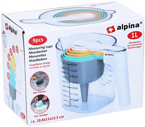 9dílná sada odměrek od Alpiny nesmí chybět v žádné kuchyni. Díky technologii stohování nejen šetří místo, ale je také všestranná. Velká odměrka má metrické značení a má kapacitu 1 litr. 6 malých odměrek má kapacitu 7,5...250 ml.Dodávka obsahuje nálevku a škrabku. Vlastnosti: - 9dílná, prostorově úsporná sada - Velká odměrka s objemem 1 l - 6 malých odměrek: 7,5 ml, 15 ml, 60 ml, 85 ml, 125 ml, 250 ml - Součástí dodávky je nálevka a škrabka - Rozměry (DxŠxV): 188x110x133 mm