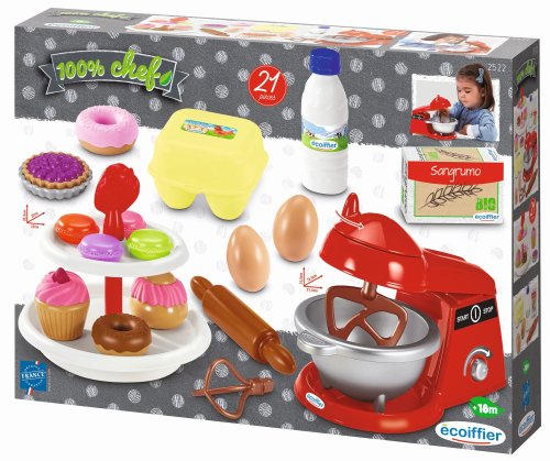Sada obsahuje kuchyňského robota s mechanickou funkcí, se 2 míchacími nástavci a s mixovací miskou, stojan s moučníky, 2 vejce, váleček, různá prázdná balení potravin, makronky, koláčky, vdolky a koblihy. Celkem 21 doplňků. Rozměry produktu (DxŠxV): 70 x 25 x 20,5 cm.