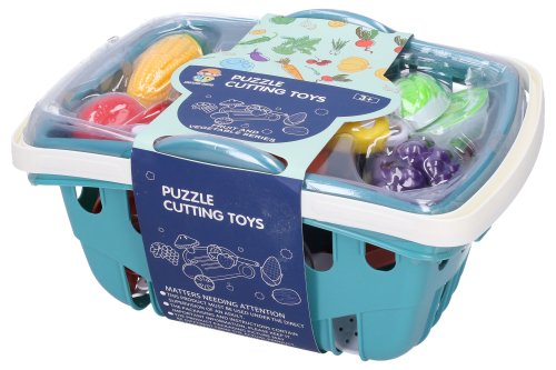 Kuchyňský set v košíku - modrý. Rozměry košíku 26x19x14 cm. Obsahuje rozkrojené ovoce a zeleninu, nůž a další nádobí.