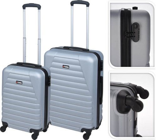 • sada dvou kufrů v různých velikostech pro různé příležitosti- odolná cestovní zavazadla se čtyřmi tichými kolečky a bezpečnostním kódovým zámkem- materiál: tvrzený ABS plast- kvalitní, nepromokavý, pevný materiál s dobrou odolností proti poškrábání- teleskopická rukojeť- v horní i boční části také elastické madlo pro ruční přenášení- hlavní velká kapsa na dvojcestný zip se zámkem- bezpečnostní zámek na číselný kód je nejlepším způsobem jak zajistit bezpečí vašeho zavazadla- vnitřní prostor kufru je vybaven elastickými pásy k připevnění obsahu- samozřejmostí jsou 4 kolečka otočná o 360°- skořepinový kufr z tvrzeného ABS plastu výborně odolává případným pádům na zem nebo větší zátěži- malý příruční kufr odpovídá definici příručního zavazadla a lze si jej vzít na palubu letadla- sada obsahuje 2 různě velké kufry:- střední kufr: 45 x 26 x 66 cm- příruční: 35 x 22 x 53 cm- barva: stříbrná- značka: PROWorld.