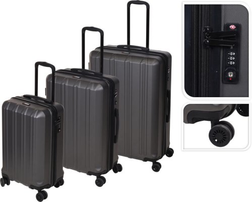 • kompletní sada tří kufrů v různých velikostech pro různé příležitosti- odolná cestovní zavazadla se čtyřmi tichými kolečky a TSA bezpečnostním kódovým zámkem- materiál: tvrzený ABS plast- kvalitní, nepromokavý, pevný materiál s dobrou odolností proti poškrábání- teleskopická rukojeť- v horní i boční části také elastické madlo pro ruční přenášení- hlavní velká kapsa na dvojcestný zip se zámkem- bezpečnostní TSA zámek na číselný kód je nejlepším způsobem jak zajistit bezpečí vašeho zavazadla- vnitřní prostor kufru je vybaven elastickými pásy k připevnění obsahu- samozřejmostí jsou 4 kolečka otočná o 360°- skořepinový kufr z tvrzeného ABS plastu výborně odolává případným pádům na zem nebo větší zátěži- sada obsahuje 3 různě velké kufry:- velký kufr: 50 x 31 x 77 cm- střední kufr: 44 x 27 x 66 cm- příruční: 35 x 22 x 58 cm- barva: tmavě šedá- značka: PROWorld.