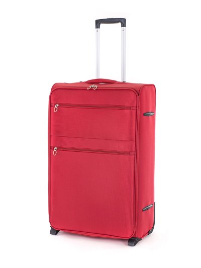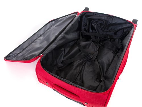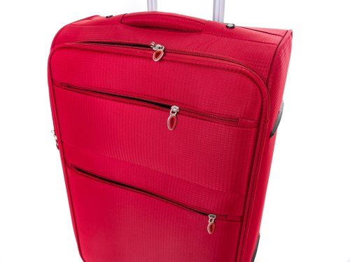 Cestovní textilní kufr TEX15, velikosti L, v červené barvě,, je vyrobený z textilie, což ocení především cestovatelé, pro které je důležitá nízká hmotnost zavazadla. Je opatřený 2 kolečky pro snadné přemístění zavazadla. Kufr má 2 textilní madla (boční a horní) a 1 plastové s teleskopickou rukojetí s pojistkou proti zasunutí a možností nastavitelné výšky ve více polohách. Díky vůli textilie, je prostor kufru možné drobně přizpůsobit. Ve vnitřním prostoru naleznete jistící popruhy a vnitřní kapsu pro lepší fixaci a uspořádání vašich věcí. Dále má dvě vnější kapsy pro umístění drobnějších věcí. Kufr se uzavírá na zip.