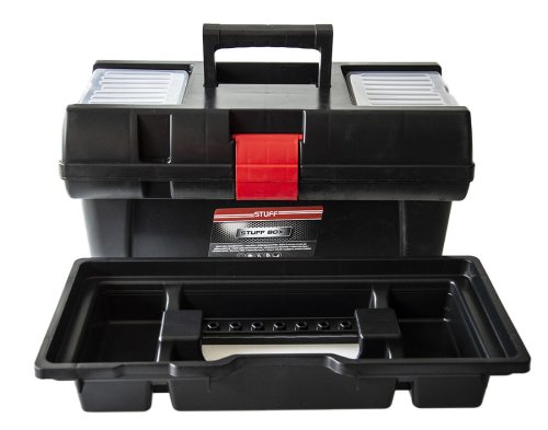 Kufr na nářadí STUFF PROFI je vyrobený z kvalitního plastu, ve vrchní části jsou dva organizéry pro drobné součástky uzavřené víkem, připraven i otvor pro visací zámek."