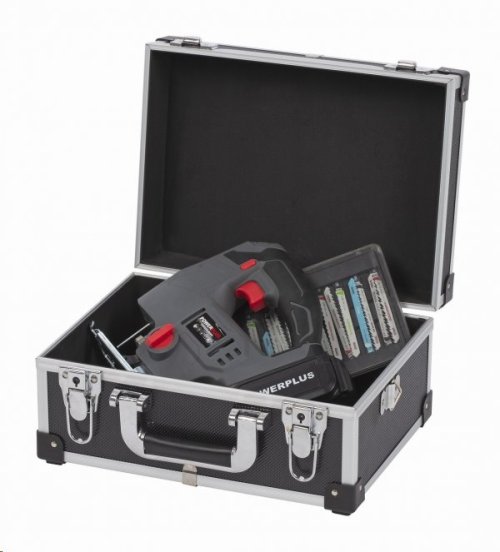 Kufřík v černo-stříbrné kombinaci barev chrání vyztužení v rozích. Samovolnému otevření brání pevné kovové klipsy a uzamykání na klíč (v balení dva kusy). Přenášení usnadňuje integrované madlo a nastavitelný popruh.