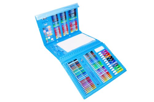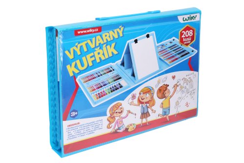 Kufřík výtvarných potřeb. Obsahuje: 48 olejových pastelů, 24 pastelek, 24 fixek, 24 voskovek, 18 akvarelových barev, 12 fixů, 15 prázdných listů, 30 sponek na papír, 4 klipy, 1 guma, 1 lepidlo, 1 pravítko, 1 ořezávátko, 1 tužka HB, 1 štětec, 1 houbička, 1 stojan, 1 paletka.