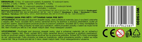 Kufřík výtvarných potřeb 50 ks Krteček. Obsahuje: 12 fixů, 12 voskových pastelů, 6 pastelek, 12 vodových barev, 1 pravítko, 2 tužky, 1 štětec, 1 guma, 1 strouhátko, 1 nůžky.
