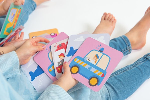 Vyberte si 6 různých kartiček ze sady a položte je lícem nahoru. Druhé kartičky z páru dejte dítěti. Požádejte jej, aby kartičky správně přiřadilo. Postupně rozšiřujte počet na 9 kartiček a pak na všech 12 kartiček. Při přiřazování kartiček do dvojic můžete postupně přidávat další úkoly. Jaké jsou druhy dopravy? Jak se nazývají dopravní prostředky? Jak se nazývá řidič? K jaké práci slouží? Atp.