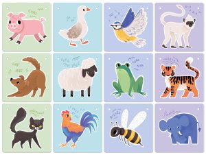 12 velkých oboustranných karet = 24 přehledných obrázků: 12 zvířat + 12 předmětů denní potřeby