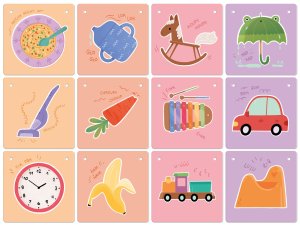Sada 24 extra velkých a přehledných obrázků - 12 zvířátek a 12 věcí denní potřeby - pomáhá dětem od 1 roku objevovat svět kolem sebe.