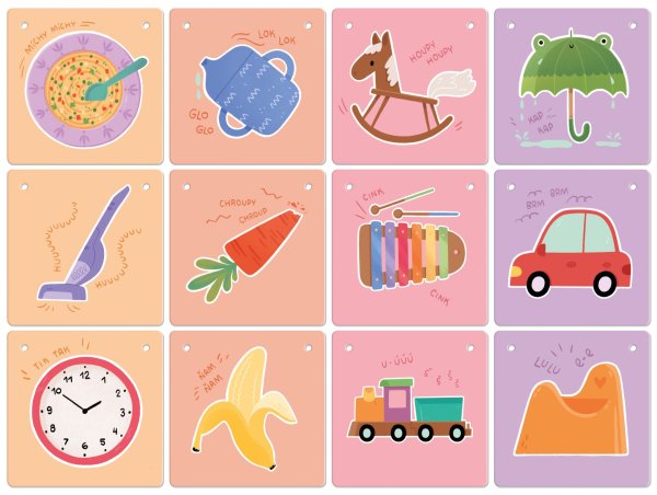 První zvuky - první slova. Hra, která přirozeně rozvíjí řeč napodobováním zvuků. Jednoduché a srozumitelné obrázky jsou doplněny grafickou nápovědou - děti napodobují zvuky, poznávají motivy a rozvíjejí komunikační schopnosti i sluchové vnímání.