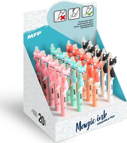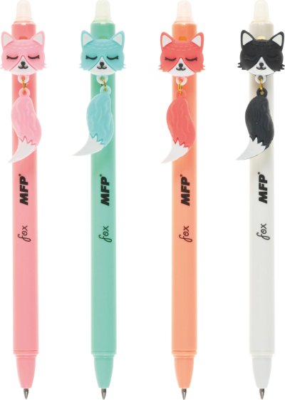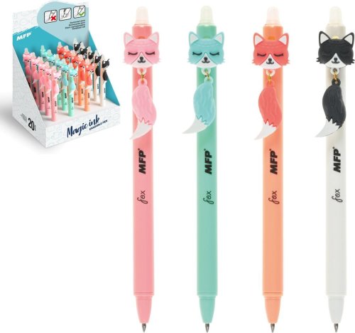 Gumovací kuličkové pero s liškou obsahuje speciální inkoust tzv. vymaž a přepiš, nebo vymaž a nech znovu objevit. Pokud uděláte chybu, stačí jen otočit pero a plastovou špičkou text vymažete. Špička zahřeje inkoust, ten zmizí a lze je znovu přepsat.