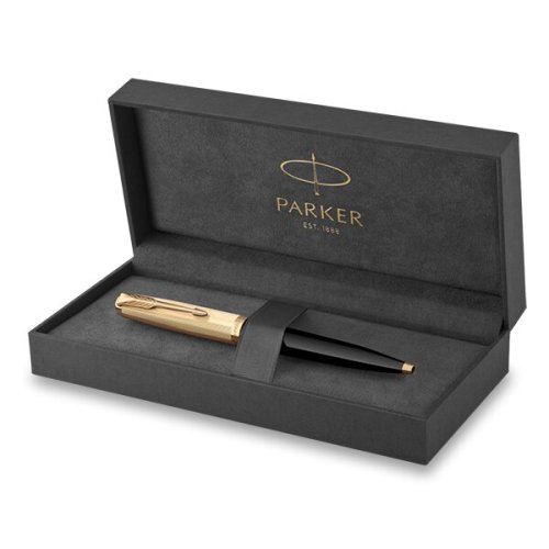 Tělo z ušlechtilé pryskyřice v černé barvě a pozlacené mosazné víčko s reliéfním zdobením vytvořeným leptáním, korunka z nerezové oceli pokovená palladiem a zlatem. V kombinaci s, doplňky pokovenými zlatem., Kuličkové pero:, * otočný mechanismus, * dodáváno s černou náplní, Stejně jako v roce 1941, kdy byl Parker 51 poprvé uveden, i dnes se jedná o průlomový a v mnoha směrech originální psací nástroj. Inspirovaný perem kdysi označovaným jako, nejžádanější na světě, si uchoval aerodynamický tvar i ikonický překrytý hrot. Také volba barevných provedení navazuje na barvy, které Parker používal v minulosti. Pero je vyrobeno z, odolné ušlechtilé pryskyřice a pozornost je věnována každému detailu – víčko i další části pera zdobí prvky z drahých kovů, jednotlivé díly jsou sestavovány ručně. Současný, Parker 51 je inspirovaný minulostí, ale stvořený pro budoucnost., TIP: Kupte si rovnou i náhradní náplň Parker do kuličkového pera.,