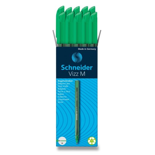 Jednorázové kuličkové pero Schneider Vizz s tělem v barvě náplně. Vyrobeno z 94 % z recyklovaného plastu. Inovativní technologie inkoustu Gelco® poskytuje stejný komfort při psaní jako u gelové náplně. Deset barevných provedení. Hrot o šíři 1 mm.