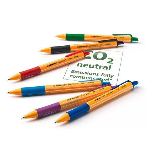 • v zájmu ochrany životního prostředí je kuličkové pero CO2 neutrální a emise jsou plně kompenzovány = JASNÝ POSTOJ K ŽIVOTNÍMU PROSTŘEDÍ, * extrémně jemný inkoust pro rychlé psaní, * pogumovaná neklouzavá úchopová zóna, * stiskací mechanismus, * barva úchopu a klipu v barvě náplně, * dokumentační modrý a černý inkoust, Náhradní náplň STABILO pointball Refill v barvě modré., [0,5 mm]ŠÍŘE STOPY 0,5 MM. , -------------------------, [Stabilo Green] , STABILO GREEN, STABILO GREEN produkty jsou charakteristické vysokým podílem recyklovaných materiálů, které byly při jejich výrobě použity. Kuličková pera jsou vyrobena až z 87 % z recyklovaného, materiálu a všechny pastelky a grafitové tužky STABILO GREEN jsou vyráběny ze 100% FSC® certifikovaného dřeva. STABILO neustále investuje do nových technologií a vyvíjí nové produkty z, recyklovaných materiálů, aby se minimalizovalo zatížení životního prostředí.