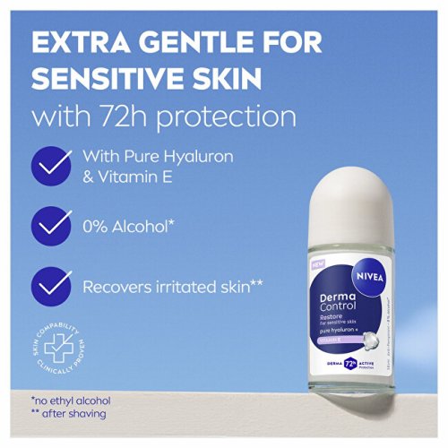 Sháníte účinný a zároveň šetrný antiperspirant, který si poradí i s velmi citlivou pokožkou? Inovativní složení s pečujícím vitamínem E chrání před podrážděním a kyselina hyaluronová hydratuje pokožku. Vyzkoušejte kuličkový antiperspirant Derma Control Restore s ochranou před potem po dobu až 72 hodin.