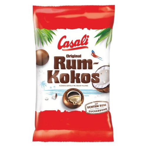 Kuličky Casali - čokoládová cukrovinka s alkoholovou náplní (10%), dražovaná, máčená v čokoládě (9%) a v mléčné čokoládě (59%)