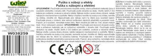 Kulomet s 12 pěnovými náboji a efekty. Rozměry 62x23,5x5 cm. Světelné, zvukové a vibrační efekty. 3xAA baterie do zásobníku nejsou součástí. Popruh součástí. Náboje se vkládají z pravé strany zbraně, nabíjení výklopnou páčkou v otvoru pro náboje.